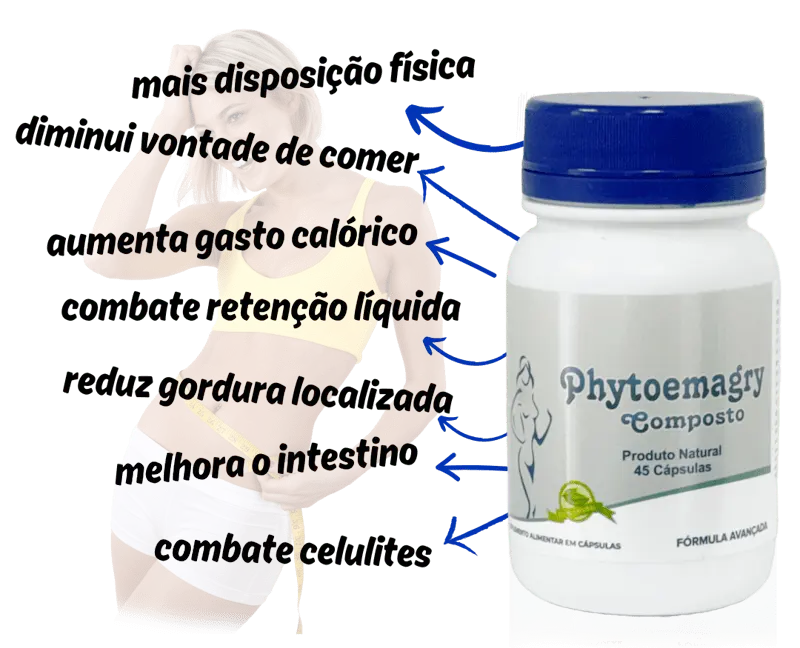 Phytoemagry é um composto desenvolvido com ingredientes naturais, atua acelerando o metabolismo do corpo, promovendo a saciedade, reduzindo o apetite, desintoxicando o corpo, regulando o intestino e reduzindo a retenção líquida, consequentemente potencializando os resultados na busca do emagrecimento.